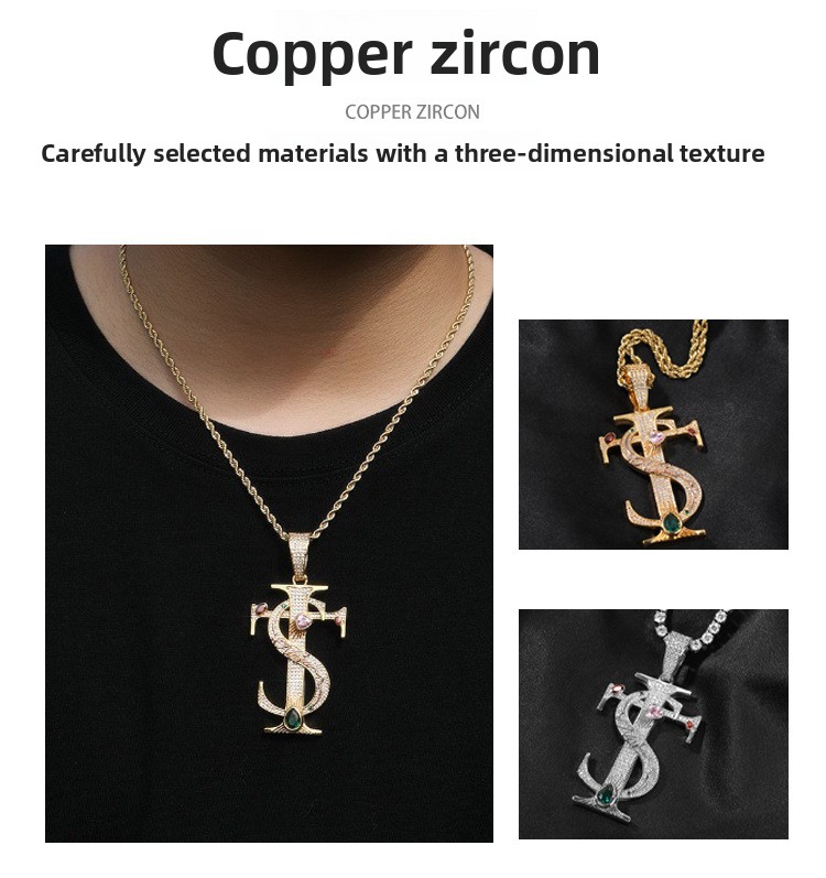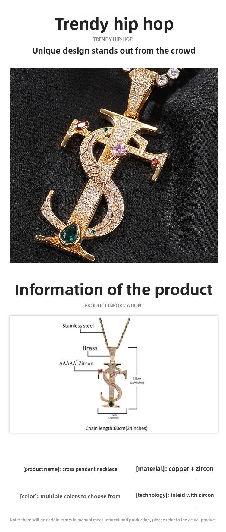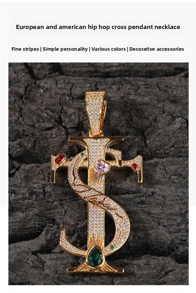 European and American fashion TS cross pendant necklace men's trendy versatile copper inlaid with colored zircon hip hop hipster same accessories